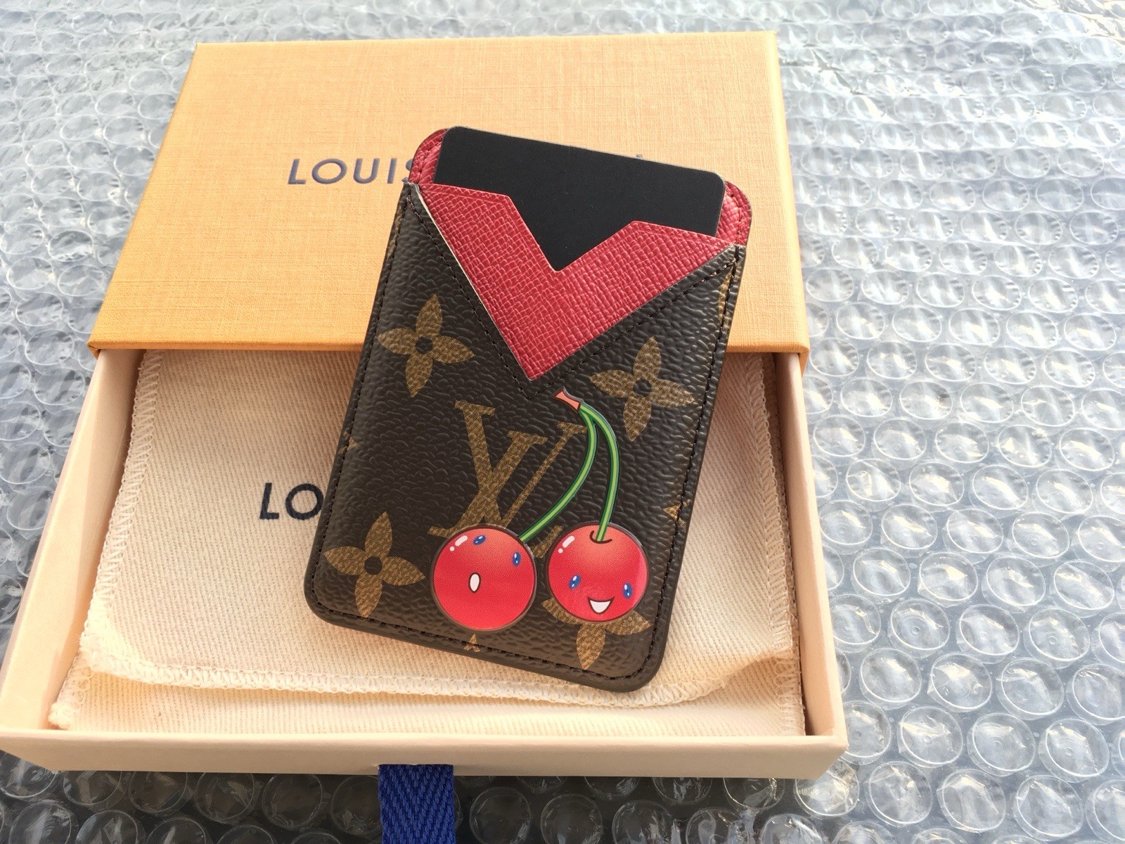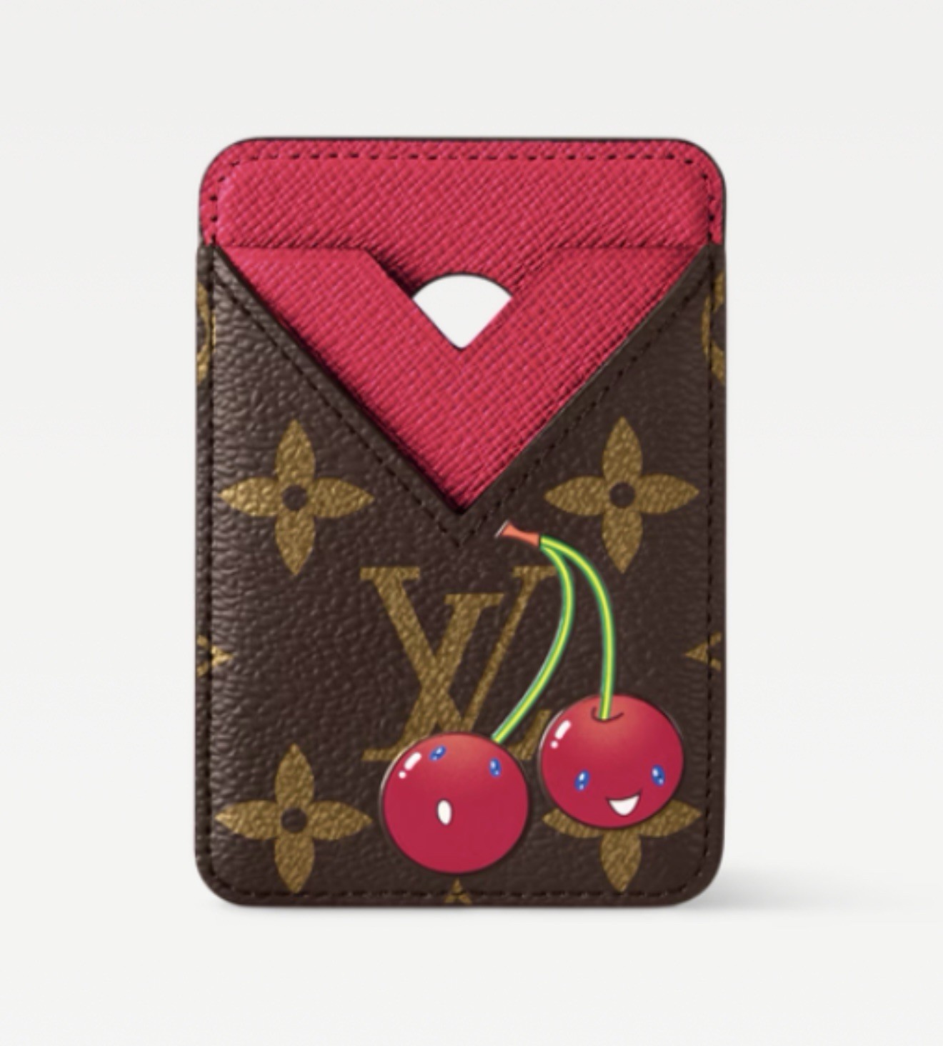 The BNIB Louis Vuitton X Takashi Murakami Card Case magnet Porte Cartes Phone Cherry is a stylish and functional accessory for women. Made from brown monogram canvas with a red textile lining, this small card case features a magnetic closure for secure storage. The collaboration with Takashi Murakami adds a unique touch to the design, making it a fashionable choice for those who appreciate luxury brands and bold statement pieces. Perfect for organizing cards or storing a phone securely, this card case combines functionality with high-end craftsmanship from Louis Vuitton.
