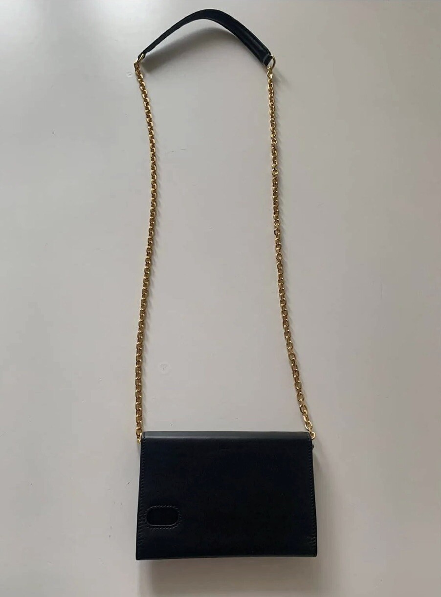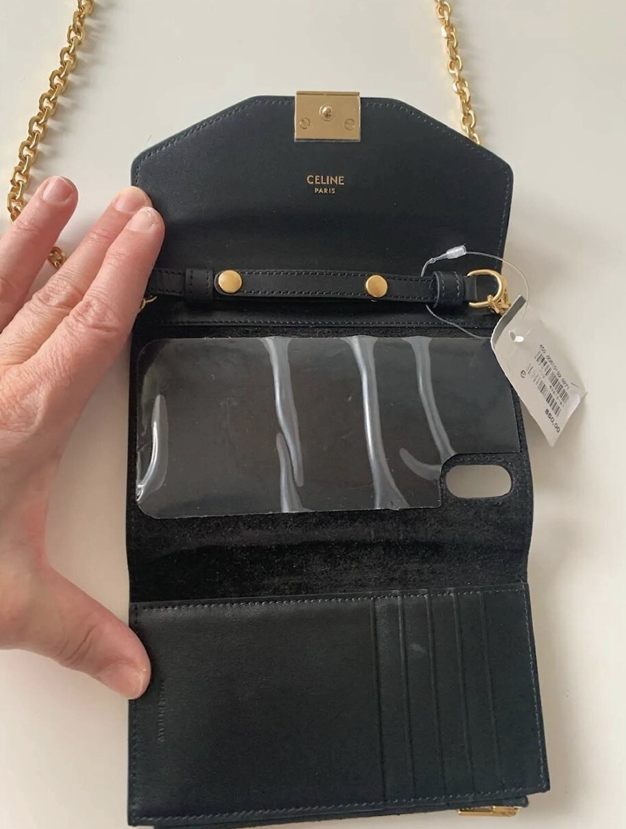 PHONE CLUTCH BLACK CELINE Magnificent small Céline bag/clutch for Iphone XS Max in black calf leather with golden finishes. Opens with a push button and is lined with alcantara and black leather. Interior features six credit card slots and a zippered coin pocket. Comes with its original box, his dustbag and all it’s papers. 号width : 14,3 cm; Height: 9,6 cm; Profondeur : 2 cm. Box has some very slight traces of almost invisible storage.