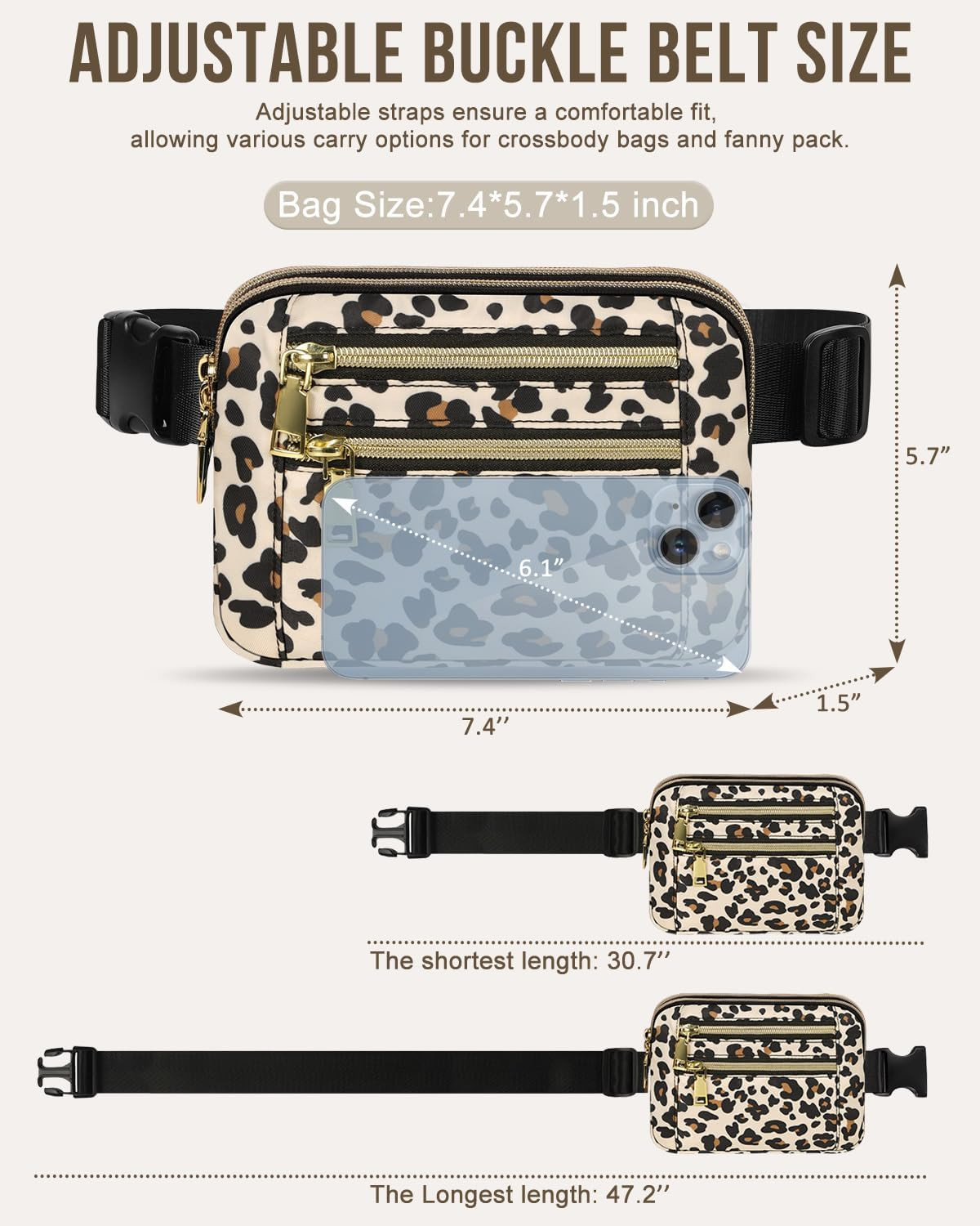 • Adjustable Belt & Sturdy Buckle: Our everywhere belt bag features an adjustable belt that extends from 32 to 49 inches, allowing you to wear it comfortably as a crossbody bag, bum bag, waist bag, or belt bag to match any outfit. We've carefully selected a strong and durable buckle that has passed thousands of open-close tests, ensuring it remains reliable and secure, so you don’t have to worry about accidental openings