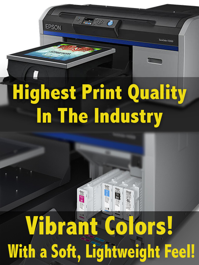Our DTG (Direct To Garment) process utilizes next-generation printing technology that produces high-quality crisp designs. The inks are durable, vibrant, and eco-safe. Every shirt is Pre-Treated with our state-of-the-art pretreatment machine. This means more vibrant colors, with more solid, richer looking dark colors. It also enhances your image detail and prevents color fading after washing and drying.