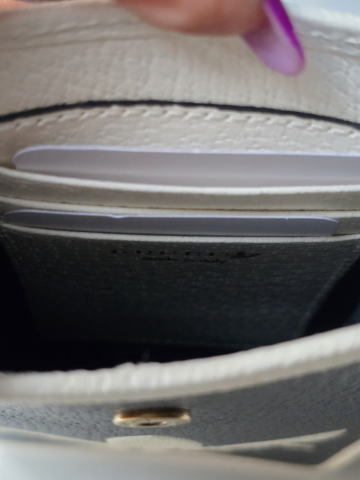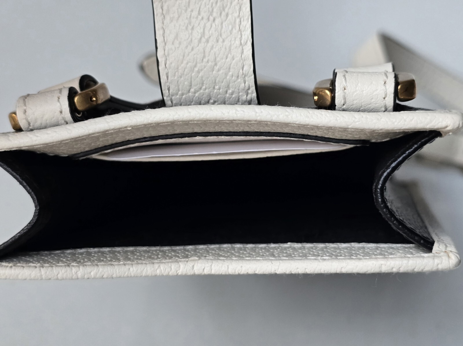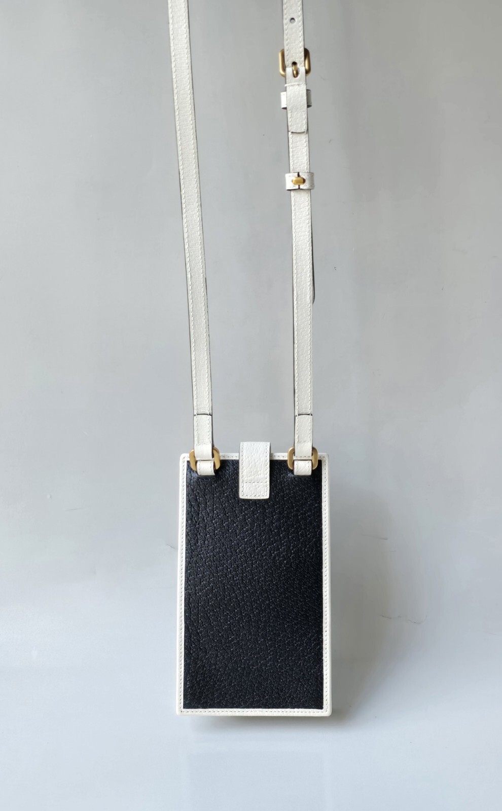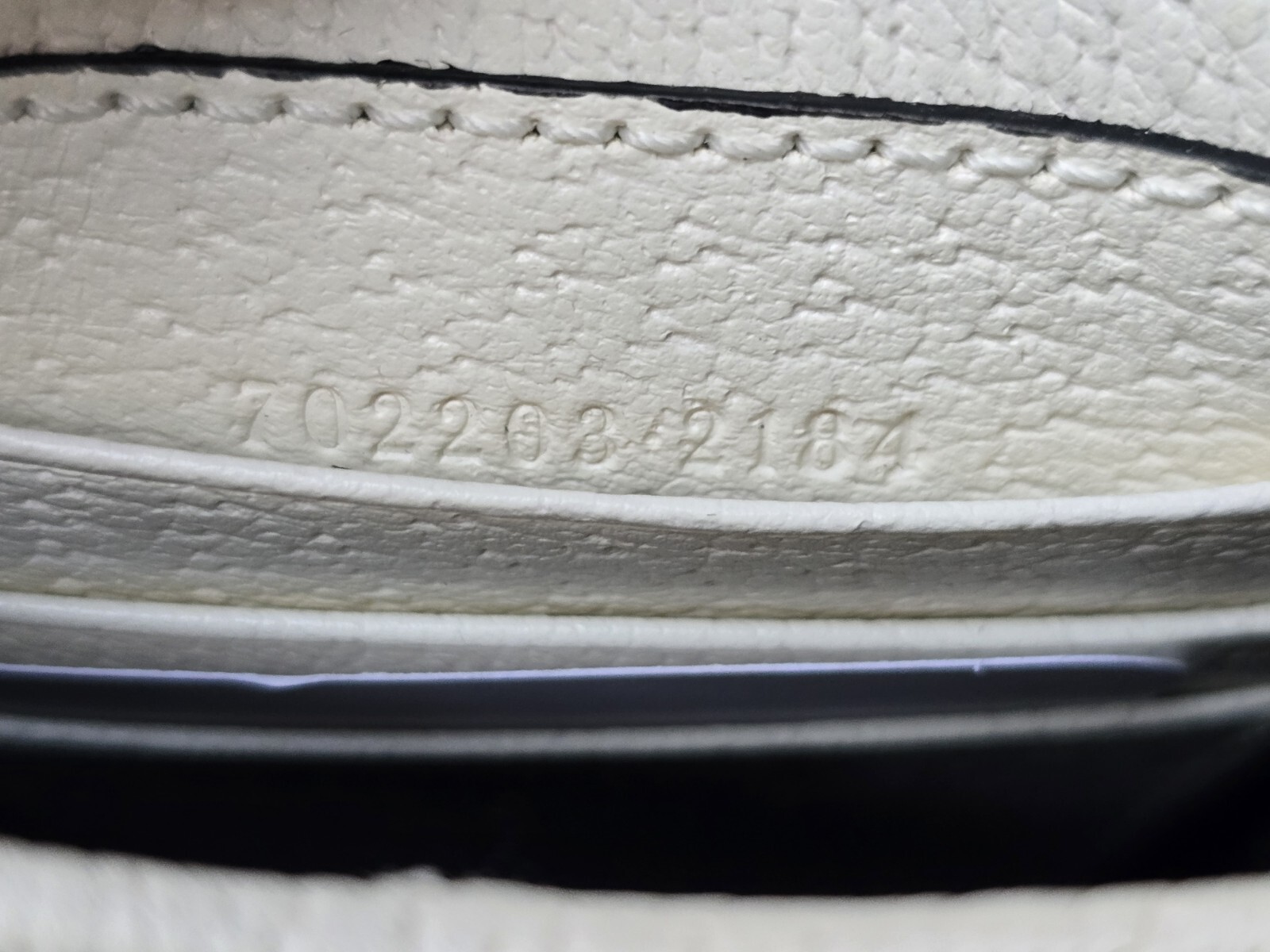 White leather trim, Trefoil and Gucci logo.