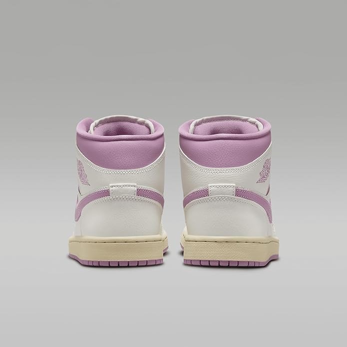 The product is a pair of Jordan Women's Air Jordan 1 Mid Fashion Sneakers in the color SAIL ORCHID MUSLIN. These sneakers feature a lace-up closure, mid-top shoe shaft style, and rubber outsole material. They are designed for casual occasions and provide comfort with a foam insole material and blended fabric lining. The sneakers belong to the Air Jordan product line and are perfect for basketball performance or everyday wear during the summer and spring seasons. Made with synthetic upper material and standard shoe width, these sneakers are a stylish and versatile addition to any woman's wardrobe.